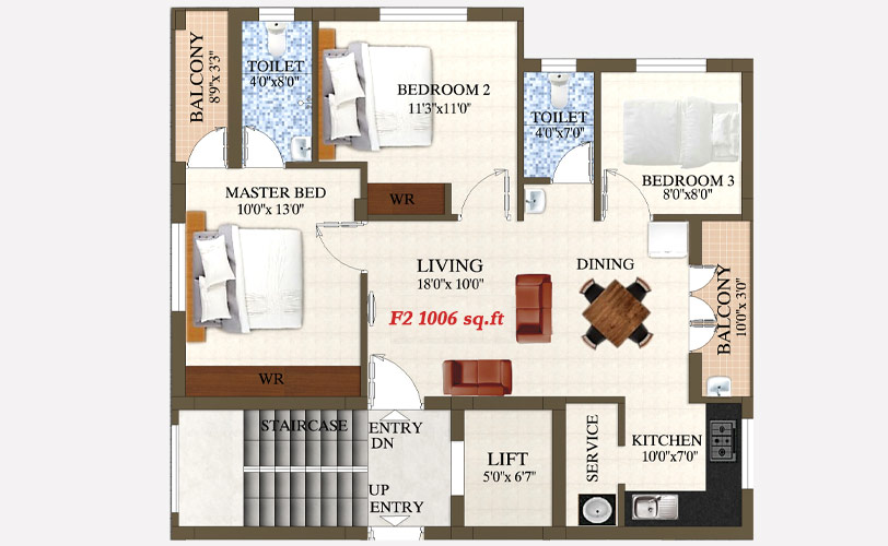| F2 | 3 Bedroom | 2 Bathroom | 2 Balcony | 1006 Sq.ft | South Facing | For Sale |